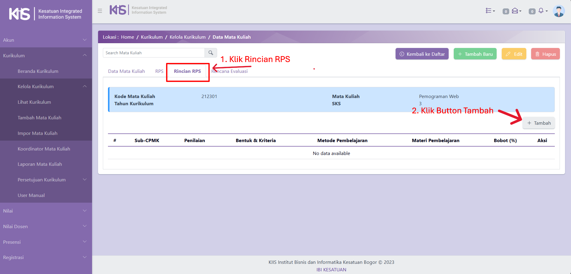 Selanjutnya, Kaprodi Klik Menu Rincian RPS, Lalu Klik Button Tambah.