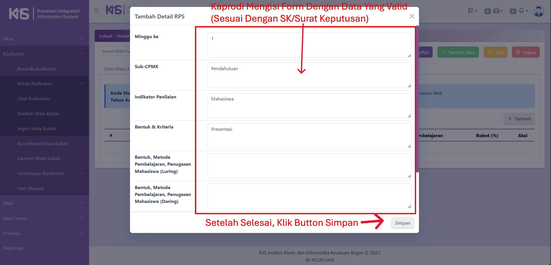 Kaprodi Mengisi Form yang tersedia sesuai dengan Mata Kuliahnya,Setelah selesai Klik Button Simpan.