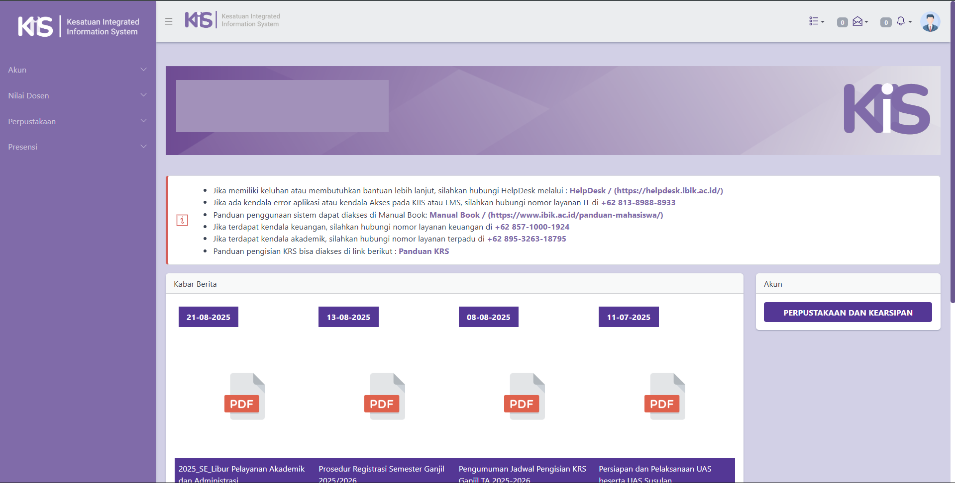 KIIS adalah singkatan dari Kesatuan Integrated Information System yang dikembangakan oleh Tim Pengembang Teknologi Informasi, Institut Bisnis dan Informatika Kesatuan (IBIK). Berikut ini merupakan Tata Cara Perpustakaan Melakukan Login pada aplikasi KIIS. Mohon pastikan Baak untuk mengingat Kode Nomor Induk Pegawai (NIP) agar dapat melakukan LOGIN melalui aplikasi KIIS.
