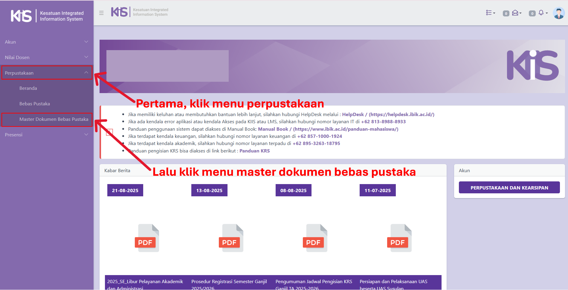 Pertama, Perpustakaan klik Perpustakaan lalu kedua Perpustakaan klik Master Dokumen Bebas Pustaka sesuai dengan tata cara di bawah berikut ini: